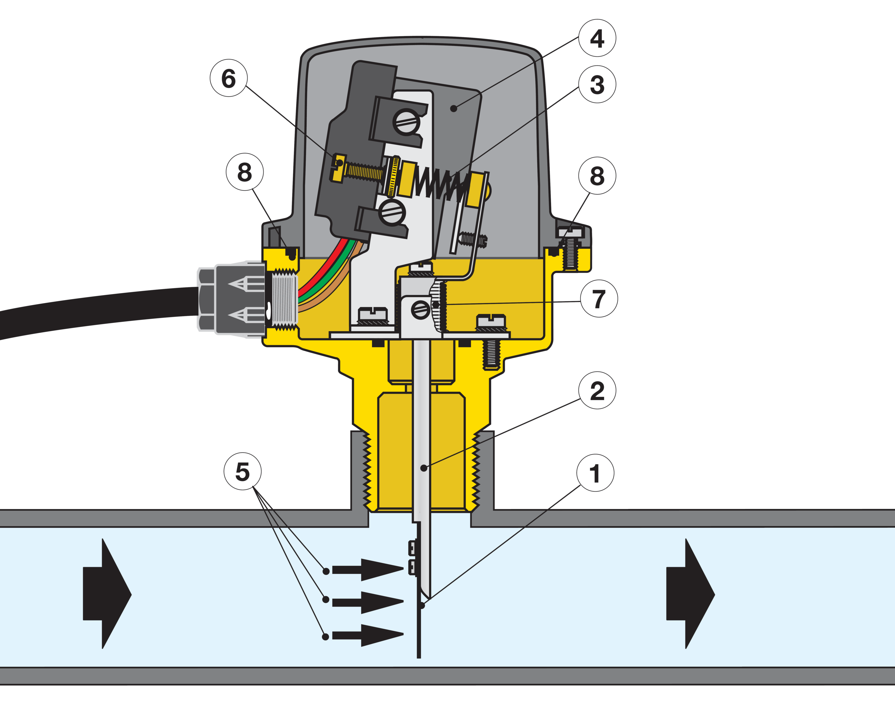 Inne i strømningsvakten er det en stav (2) som er festet til et blad (1) som er tilpasset den aktuelle rørdimensjonen.  Staven er igjen festet til en fjær (3) som man kan stille på. Når vannmengden blir tilstrekkelig (5) vil dette føre til at staven beveger seg og det blir kontakt i mikrobryteren (4). Ved å stille på skruen (6) kan man stille inn strømningsvakten til den aktuelle vannmengden. Dette gjøres ved at man justerer til riktig vannmengde, og  justerer skruen til man har kontakt, og reduserer vannmengden igjen til kontakten bryter. En metallbelg (7) sørger for at det ikke kommer vann i kontakt med de elektriske komponentene inne i strøningsvakten-